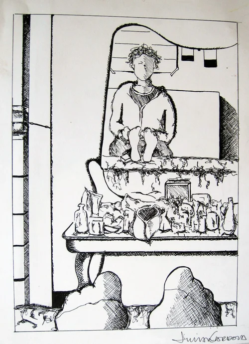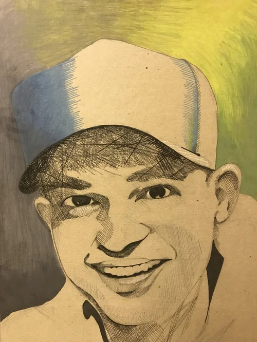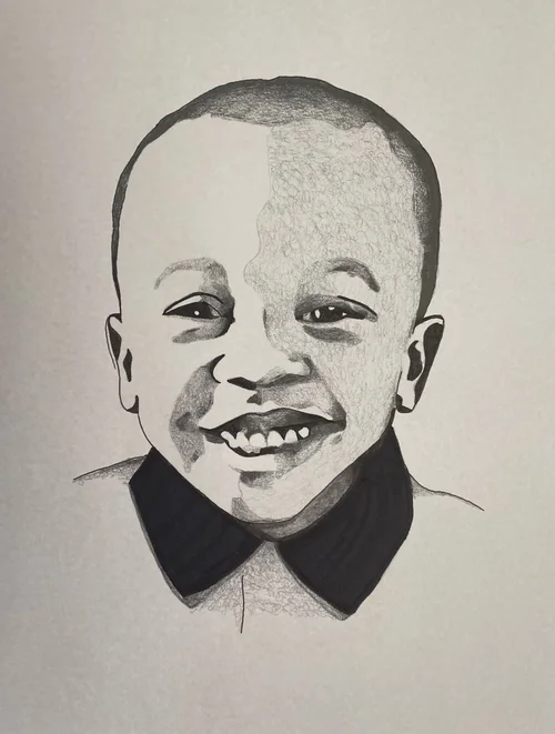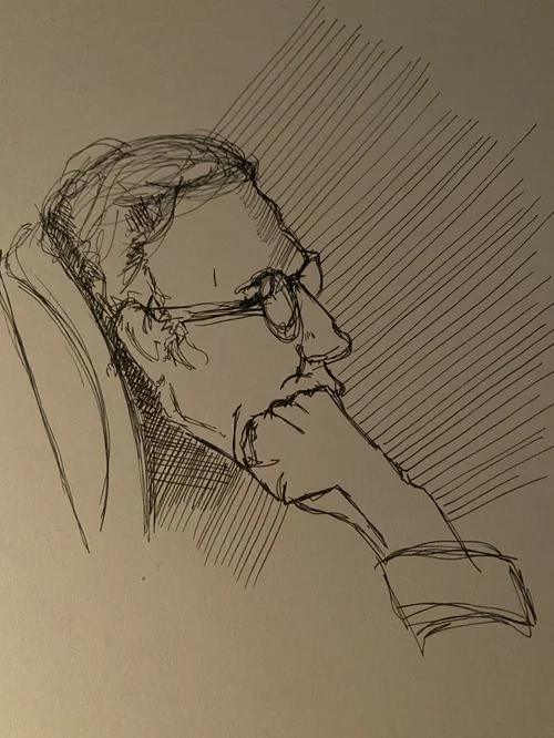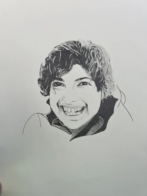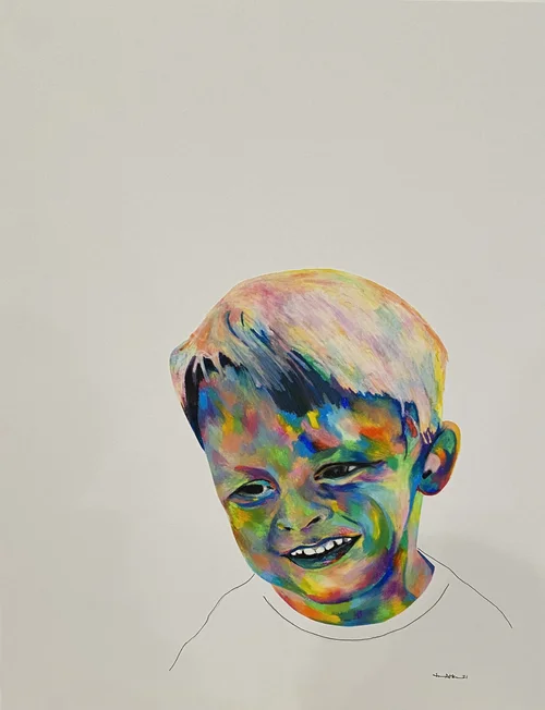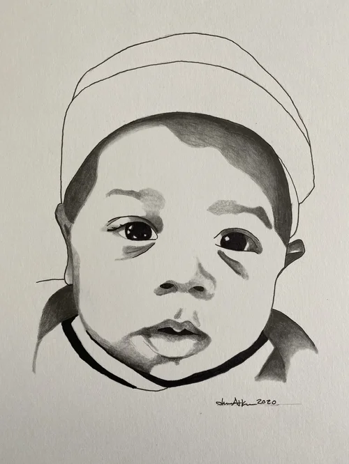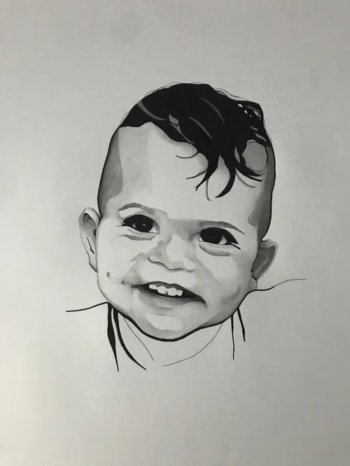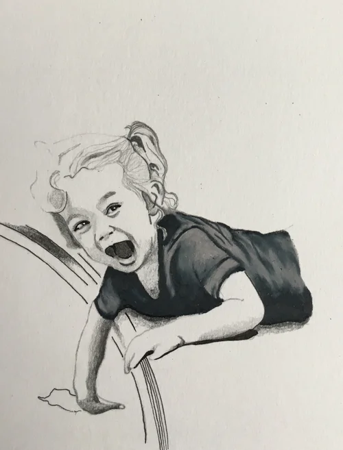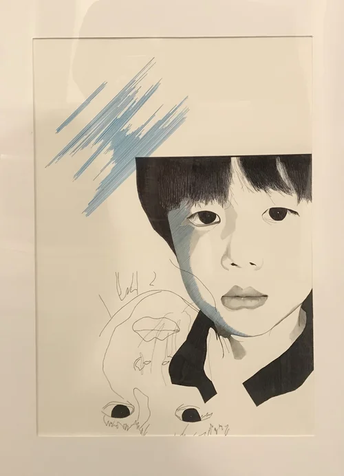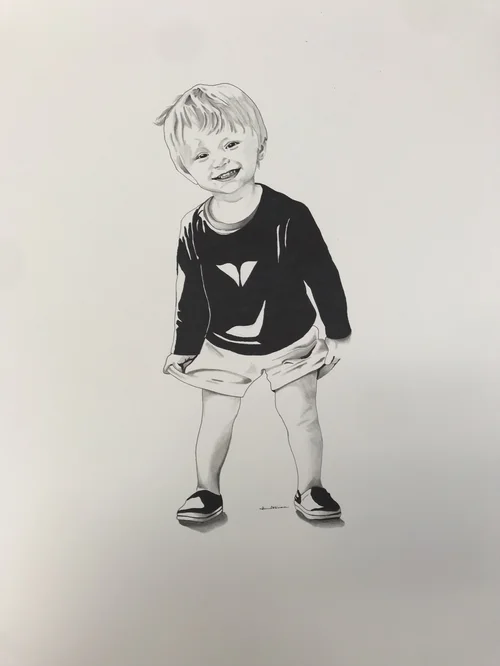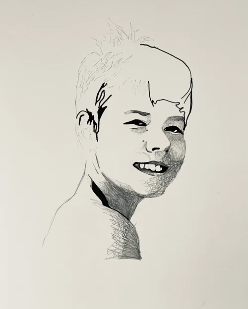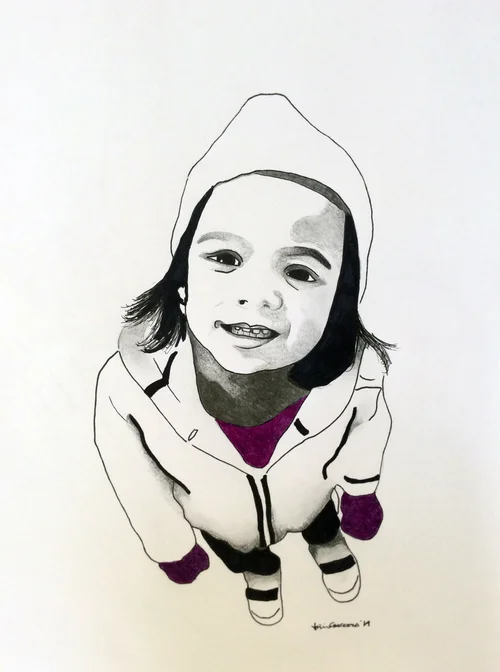 While on a field trip with my South Korean students, I tried everything to keep a fever-stricken child entertained – funny faces into the camera included. During an outtake, his unfortunate misery was quite apparent –I had to try to capture his strong emotion with my pen.