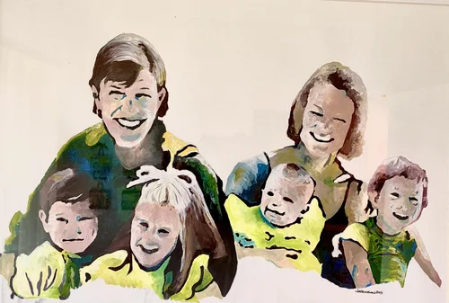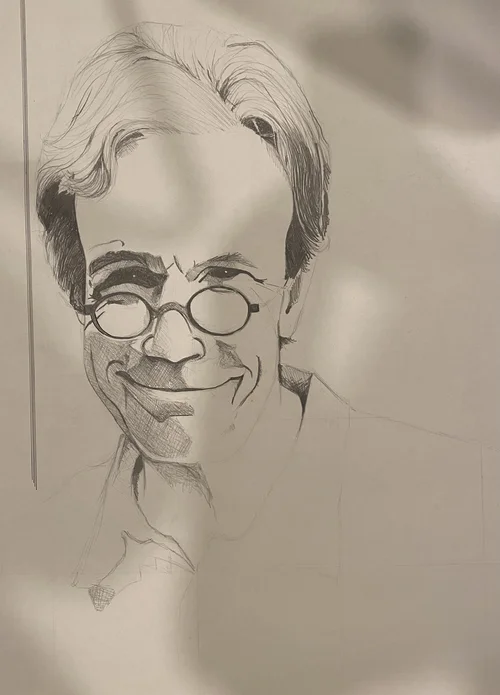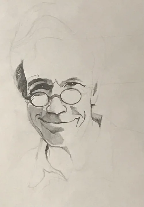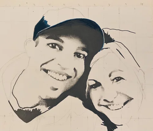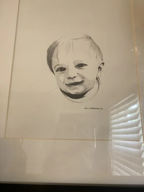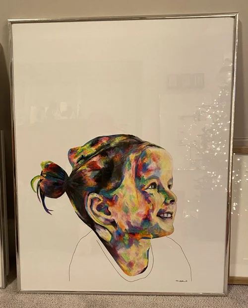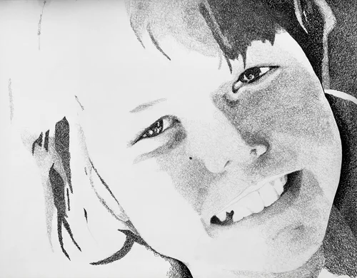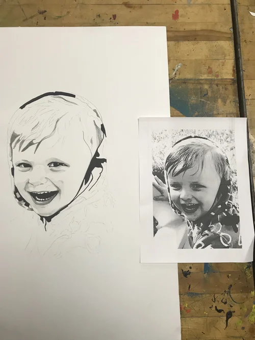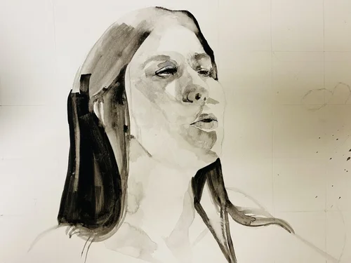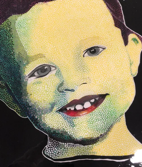 During one of my drawing classes in Italy, I was sketching a face and hung it up on a tack board to view my proportions. As I stepped back, I enjoyed to splattered paint in the background and photographed the unexpected image.